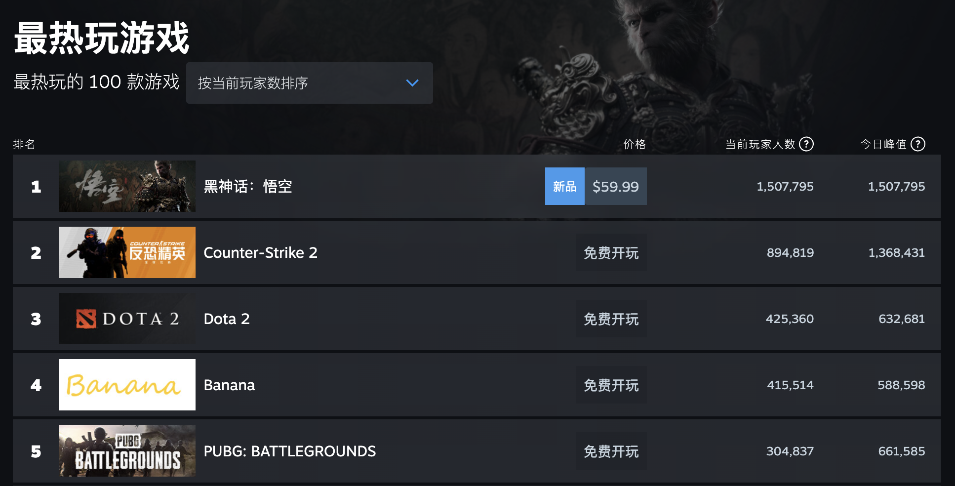《黑神话:悟空》Steam同时在线玩家突破150万