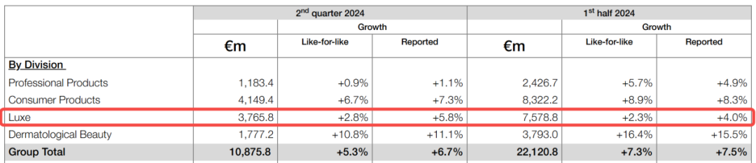 结合上述因素的影响,高档化妆品部成为欧莱雅四大业务板块中,增速最低的板块。2024年上半年,以2.3%的增速居末位。