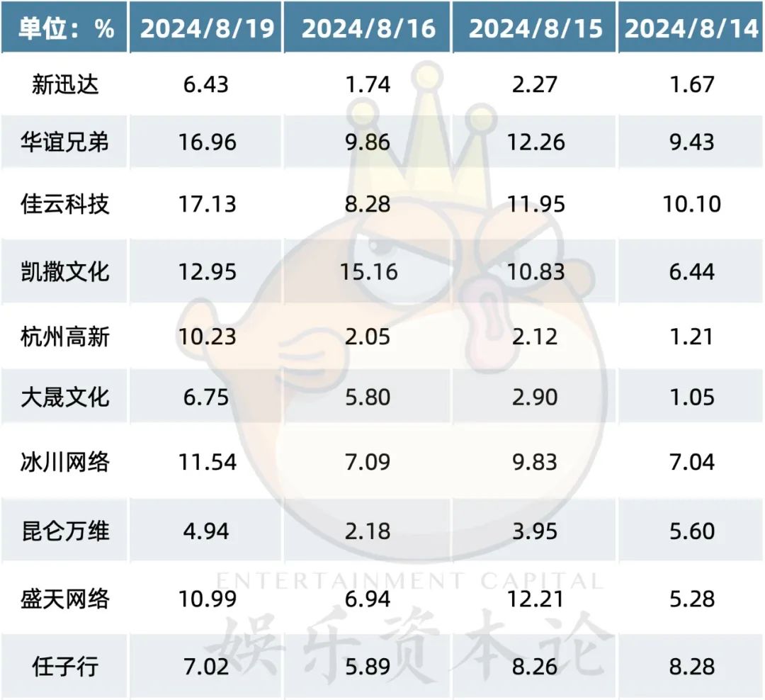 事实上,华谊兄弟、凯撒文化等都延续了多日的上涨趋势。同时华谊兄弟、佳云科技等多只股票换手率也放大至10%以上,表明此轮行情中短线交易频繁。