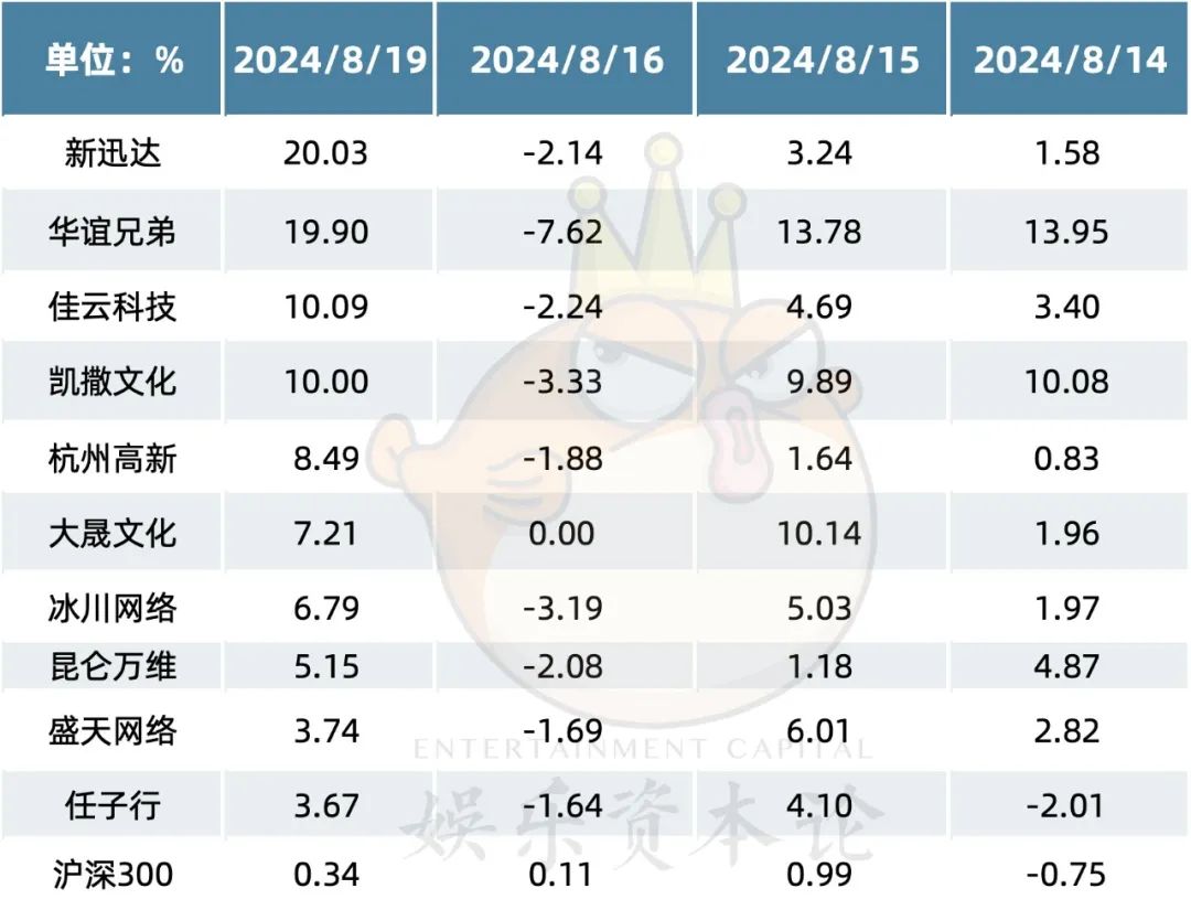 8月19日,网络游戏概念股中新迅达、华谊兄弟、佳云科技、凯撒文化涨幅超10%;杭州高新、大晟文化等跟涨。