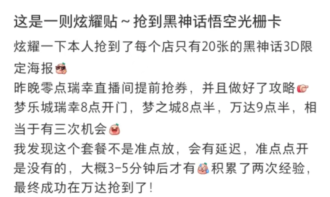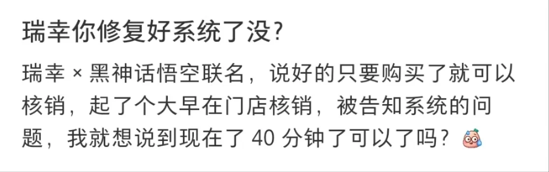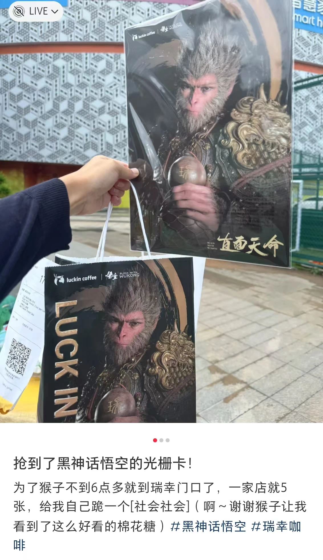 8月20日上午10点,《黑神话:悟空》正式在全球上线。当日,从游戏上线开始即登榜微博热搜第一,且持续了一上午,#黑神话悟空#话题阅读量高达15.2亿次。同样,在前一天上线的瑞幸联名活动也位居多个社交媒体讨论热度榜单,#瑞幸 黑神话悟空#微博话题阅读量已超过2200万次,#瑞幸黑神话周边补货通知#阅读量也接近300万次。