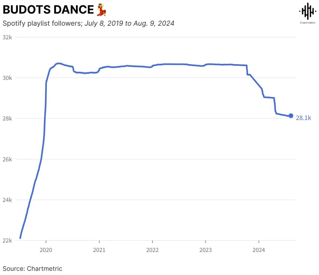 此外,越来越多的Budots播放列表也紧随潮流,出现在Spotify上。如播放列表“ Budots Dance Remix ”的关注量在七月底大幅度增加。