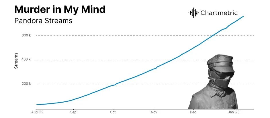 以2022年在TikTok上爆火的嘻哈音乐的子流派Phonk为例,Kordhell的《Murder In My Mind》在Spotify上超过6亿次,在TikTok视频内容数量达到100万。TikTok用户经常将这首歌作为背景音乐,配合赛车高速漂移、游戏卡点、爱豆出场画面,让Kordhell甚至成为了当年Chartmetric增长最快的艺术家之一。