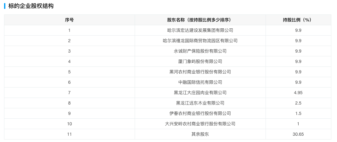 除永诚财险外,哈尔滨农商行还有5名并列第一大股东,分别是哈尔滨宏达建设发展集团有限公司、哈尔滨禧龙国际商贸物流园区有限公司、厦门象屿股份有限公司、黑河农村商业银行股份有限公司、中融国际信托有限公司,均持股9.9%。