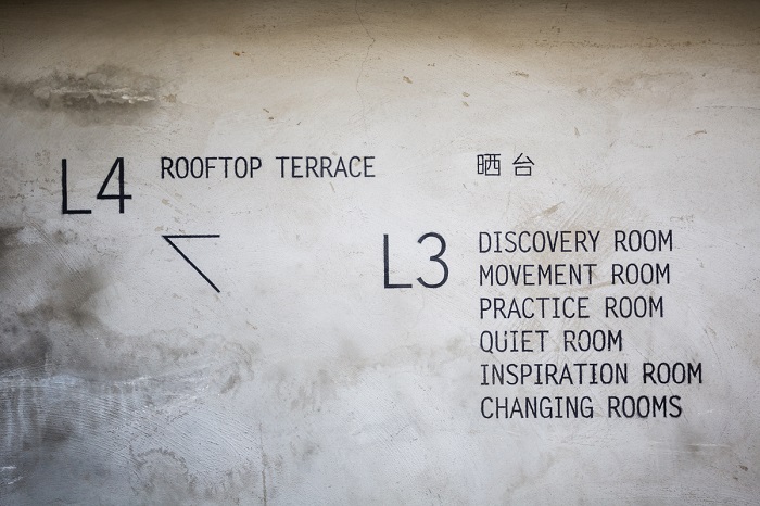 整个空间被简约的线条勾勒,时不时出现缓缓的坡道,高挑的天井由平行交叉的廊桥填补,水泥墙上是用黑漆写下的楼层指引,干净简洁中透露出设计师的巧心。
