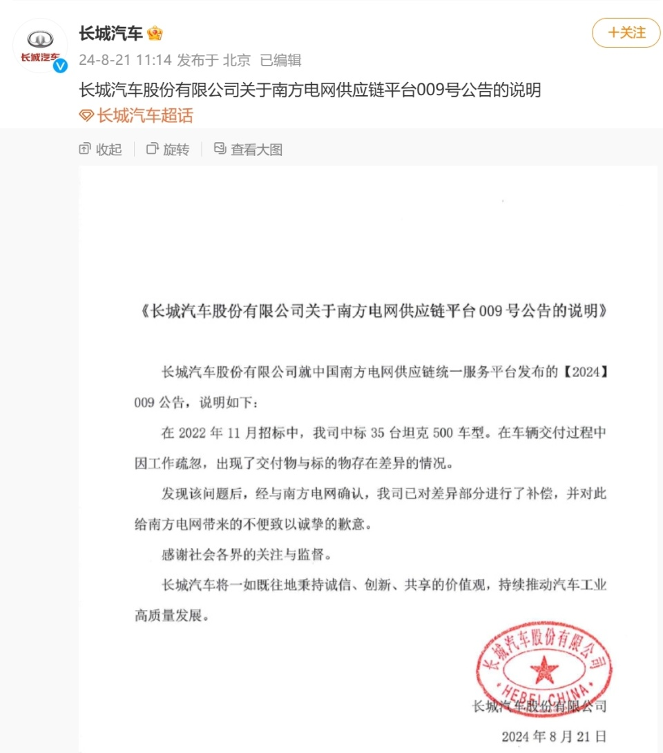 8月21日上午,长城汽车官方微博账号发布了一则关于南方电网供应链平台009号公告的说明。