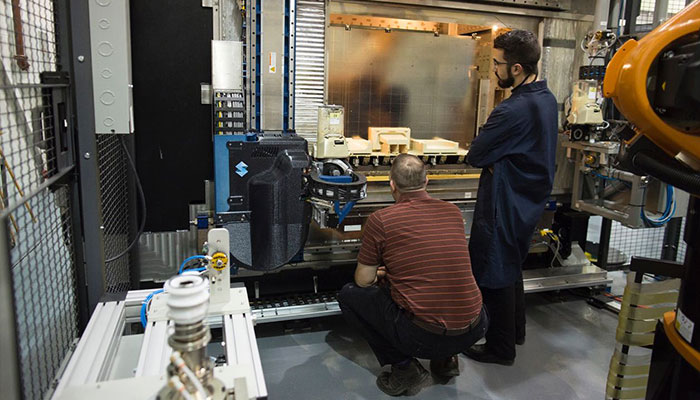 类似一间房屋般大小的打印机坐落在福特位于密歇根州的迪尔伯恩研发创新中心内。美国汽车制造商设想将打印机用在低产量的车型之上,而赛事项目用车就是很好的选项。