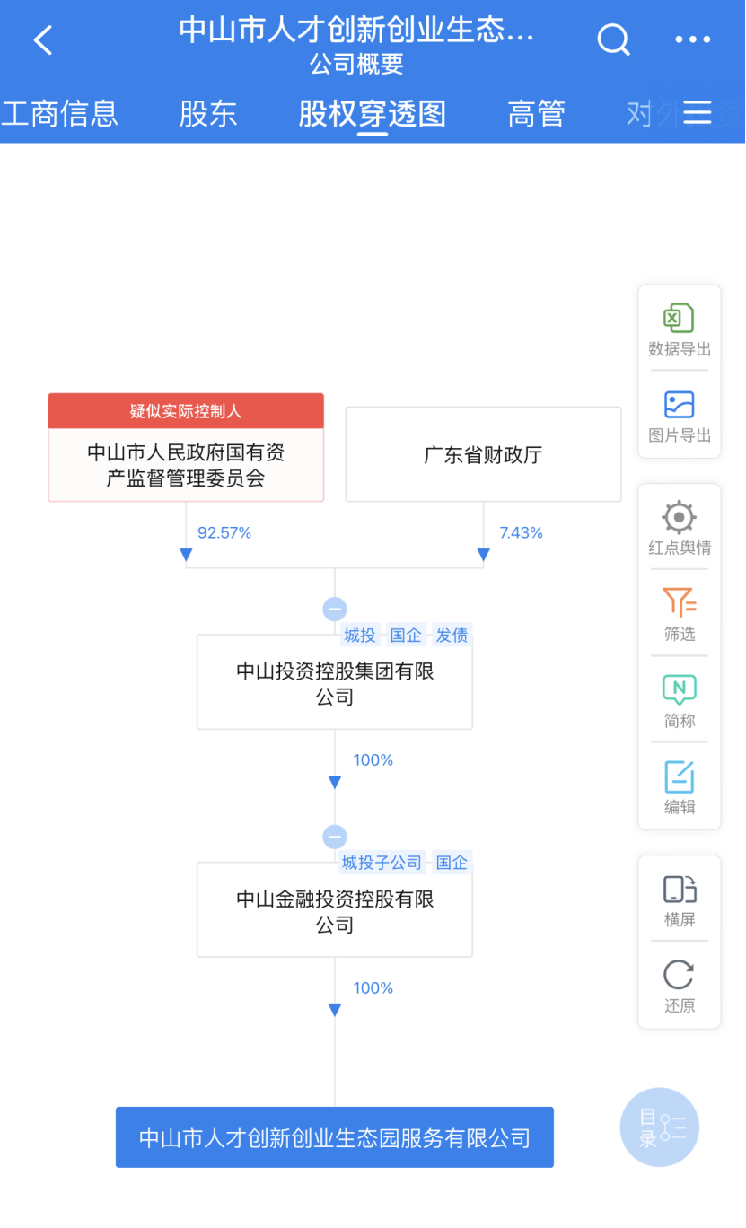 天眼查信息显示,中山人才生态园是中山投资控股集团的全资孙公司,实控人为中山市国资委,而岭南股份实控人为中山火炬高技术产业开发区管理委员会(简称“中山火炬区国资”),两家公司背后均为中山国资。