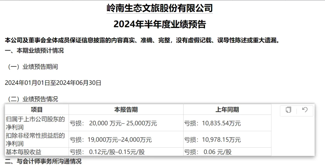 到2024年一季度,岭南股份账面货币资金只有2.47亿元,有息负债则为45.03亿元。财务费用为0.59亿元。据岭南股份7月11日发布的业绩预告,2024年上半年,预计净利润为亏损2亿元至2.5亿元,与上年同期亏损1.08亿元相比,亏损进一步扩大。
