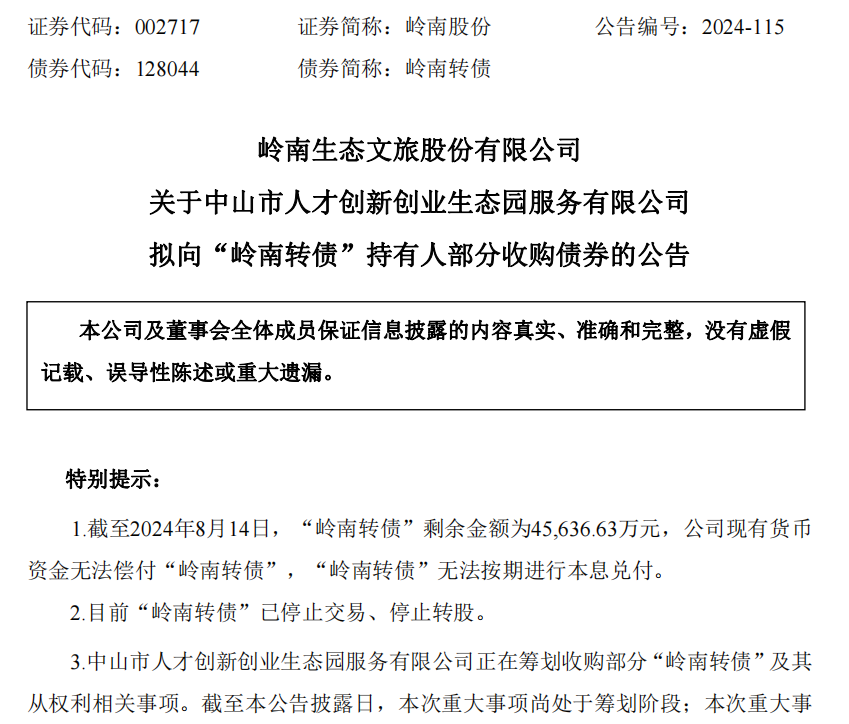 此前8月14日晚间,岭南股份发布了不能按期兑付“岭南转债”本息的公告,岭南转债发生实质违约。截至8月14日,“岭南转债”剩余金额为4.56亿元,岭南股份现有货币资金无法偿付“岭南转债”。