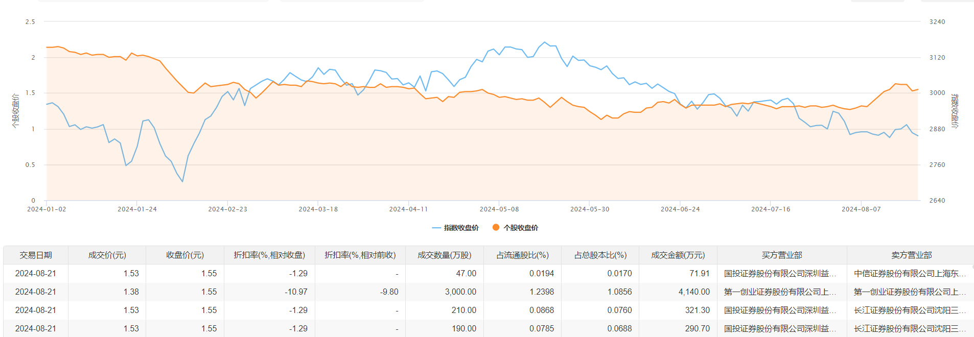 奥瑞德8月21日大宗交易成交3447万股,成交额4823.91万元,占当日总成交额的20.81%,成交均价1.4元,较市场收盘价1.55元折价9.68%,其中最高成交价1.53元,最低成交价1.38元。