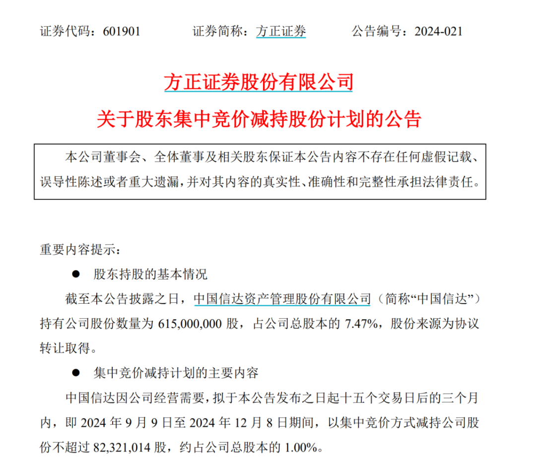 据公告显示,2022年11月,中国信达计划减持不超过1.65亿股,约占方正证券总股本2%。这次并未成功实施减持;2023年7月,中国信达再次计划减持不超过1.65亿股,约占方正证券总股本2%。该次累计减持公司股份8232.1万股,占方正证券总股本1%;2024年4月,中国信达又计划减持不超过8232.1万股,约占公司总股本的1%。该次累计减持公司股份1256.54万股,占方正证券总股本0.15%。