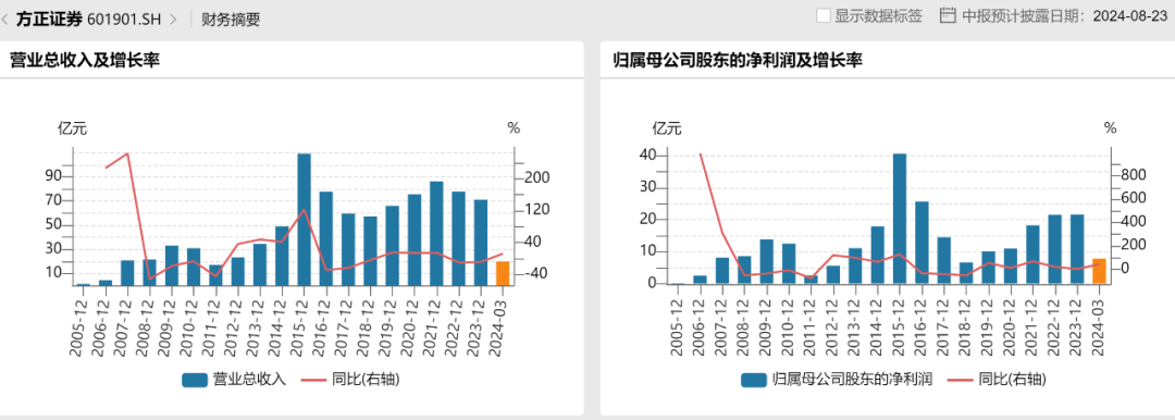 2024年一季度,方正证券营收净利双增,实现营业总收入19.85亿元,同比增长11.97%;归母净利润7.84亿元,同比增长41.06%。