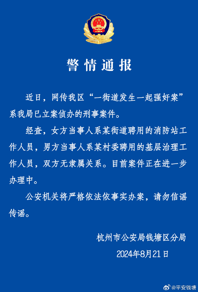 杭州市公安局钱塘区分局8月21日晚发布警情通报称,近日,网传我区“一街道发生一起强奸案”系我局已立案侦办的刑事案件。经查,女方当事人系某街道聘用的消防站工作人员,男方当事人系某村委聘用的基层治理工作人员,双方无隶属关系。目前案件正在进一步办理中。