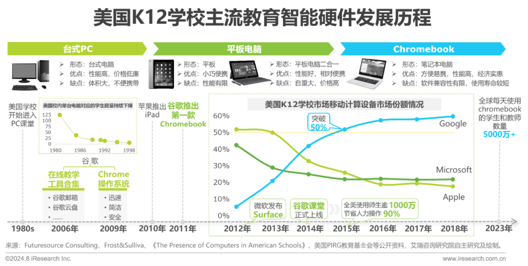 在海外市场,学习平板与笔记本电脑是更为主流的教育智能硬件,截止2023年,全球每天有5000万师生使用Chromebook,而2022年海外教室交互平板(教育大屏)的渗透率不足10%。美国是海外市场的典型代表。根据Project Tomorrow的调查数据,2022-2023学年,美国84%的K12教师表示其学生有个人专属的设备。回顾历史,自20世纪80年代起,苹果、微软两大科技巨头开始竞相争夺美国教育市场,引领美国K12学校进入PC课堂,随着每台PC对应的学生数量持续下降,学生的数字素养持续提升,教育数字化逐步发展。2010年,苹果首度推出平板电脑iPad,谷歌不甘落后,于2011年推出Chromebook笔记本电脑,微软于2012年推出平板电脑二合一产品Surface。其中,谷歌的Chromebook在五年时间内便成为美国使用最广泛的教育设备,2015年Chromebook在美国K12学校中市场份额占比突破50%。尽管谷歌入局较晚,但在Chromebook引领下,谷歌逐渐反超苹果和微软,形成主导美国K12教育校内市场的态势。