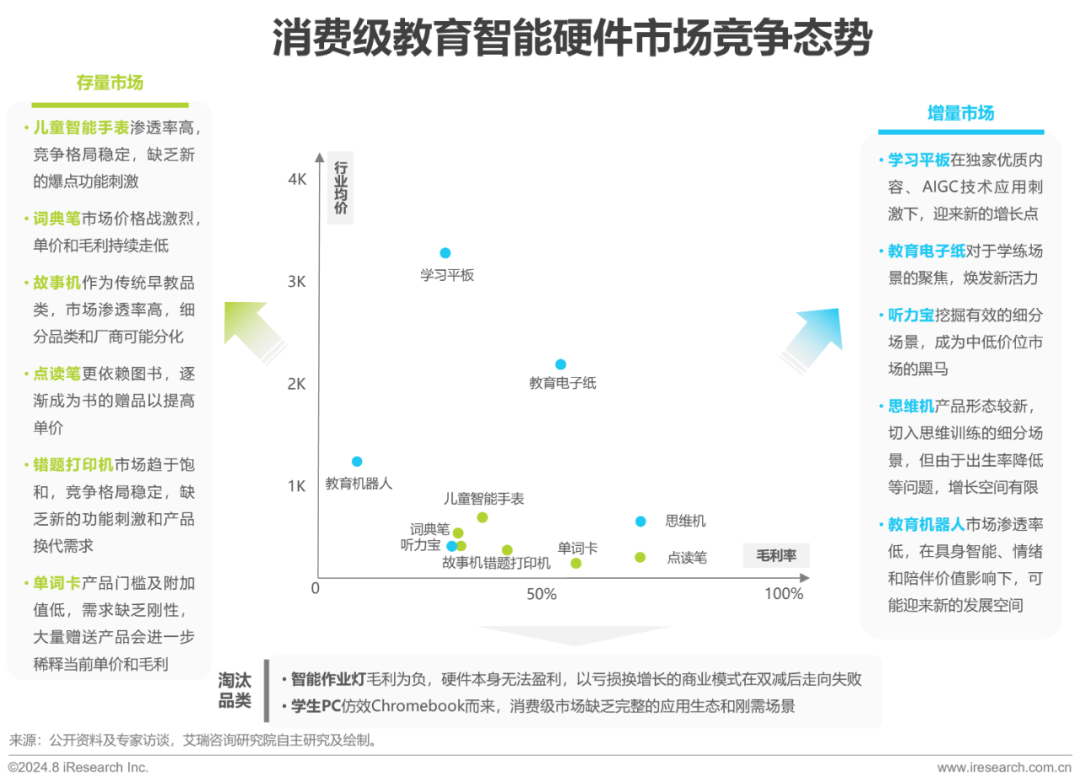 词典笔在早期主要实现离线扫描功能,硬件形态较为固定,后随着新厂商的进入,智能化程度的提升,软硬功能逐渐活泛,软件增加口语练习等功能,内容拓展至全科,硬件屏幕更大,笔头也更宽;近期随着竞争进一步加剧,软硬功能加速升级迭代。硬件通过外加摄像头、笔盒等配件,形态丰富多样,软件和内容依托大模型技术也有了显著提升。然而虽然产品功能在逐步升级,但词典笔的行业均价却不断下探。作为单功能的工具类产品,词典笔的标准化程度高,进入门槛低,产品难分档,产品升级跟进速度快,市场快速成熟并进入价格战,产品毛利逐渐走低,市场格局和体量趋于稳定。