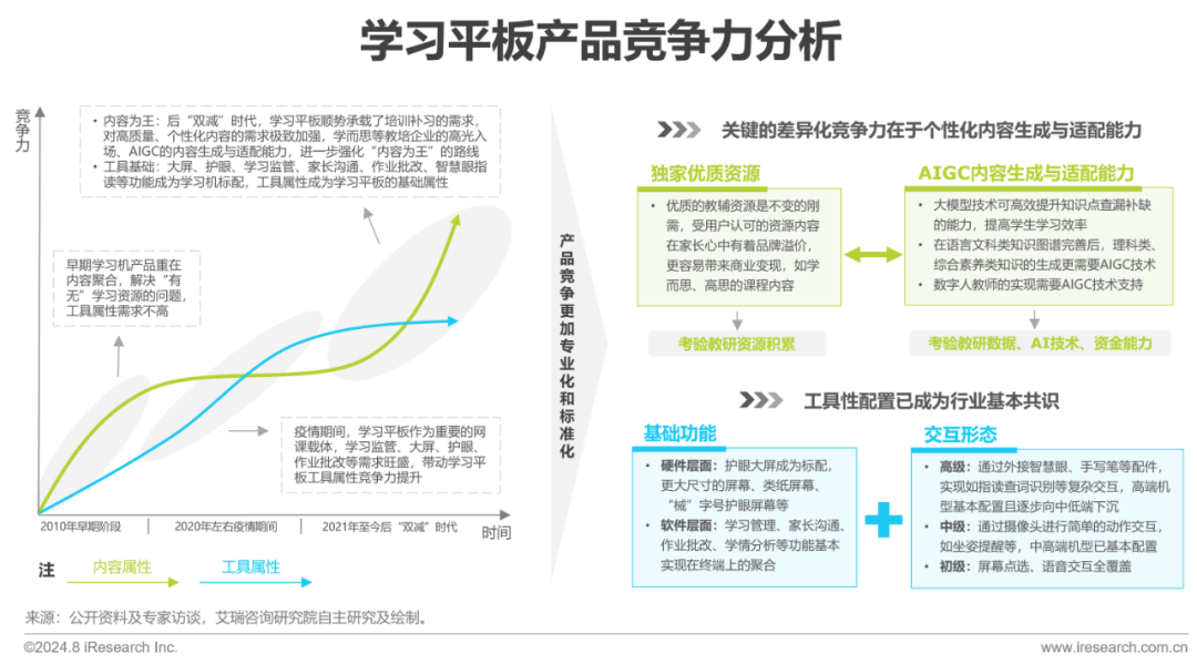 “内容为王”路线的重提,带领学习平板产品竞争走向专业化和标准化。早期的学习机强调内容资源的聚合,智能化、优质资源需求不高。后由于疫情的常态化发展,学习平板作为重要的网课载体,学习监管、大屏护眼、作业批改等需求旺盛,带动学习平板的工具属性竞争力增强。后“双减”时代,学习平板顺势承载了培训补习的需求,对高质量、个性化内容的需求极致加强,学而思等教培企业的高光入场、AIGC技术的内容生成与适配能力,进一步强化了“内容为王”的竞争路线。同时,随着学习平板的工具性配置成为行业共识,以及渠道能力逐渐成熟,独家优质的内容资源以及大模型支持下的内容生成与适配能力成为了差异化竞争力。