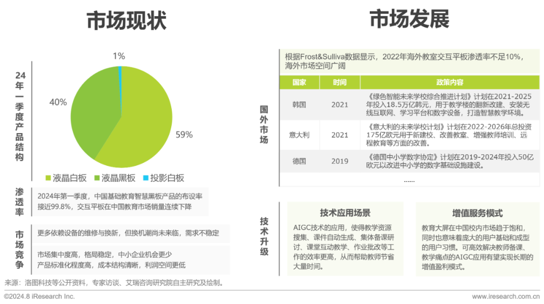 教育交互大屏在中国基础教育校内的渗透率接近饱和,近年来销量呈现连续下降的态势,且换机潮尚未来临,业务更多依赖设备的更新与维修,需求不稳定。同时,当前国内市场集中度高,竞争格局基本稳定,产品标准化程度高、成本结构清晰,利润空间也较低。从增长机会点来看,当前海外市场的渗透率低,且各国政策在积极推动,海外市场由此成为各厂商发力的重点方向。同时教育大屏也是AIGC技术应用落地的重要方向。AIGC应用可辅助教师完成部分备课规划、作业批改的工作,帮助教师节省大量时间,是AIGC应用中兼具刚需性与较高落地成熟度的场景。同时,教育大屏在中国校内有着庞大的用户基础和成型的用户习惯,体验好、效率高的应用可能实现长期的增值盈利模式。