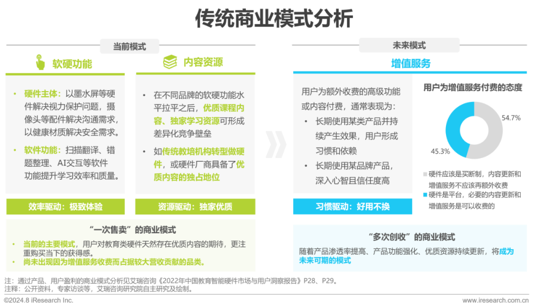 从现状来看,当前仍以通过产品盈利的模式为主,如软硬功能、内容资源等。数据服务、广告推送等通过用户盈利的方式仍十分少见。在通过产品盈利的模式中,软硬功能加内容资源的“一次售卖”模式为主流,用户对教育类硬件天然存在优质内容的期待,更注重购买当下的获得感。当前尚未出现因为增值服务收费而占据较大营收贡献的品类。但随着产品渗透率的提高,因品牌信任或产品依赖而带来的增值服务多次收费或将成为未来可期的模式,如学习平板中独家优质教育资源的收费更新,或教育大屏中辅助教师教研的高级工具等。从用户调研来看,接受增值服务付费的用户已占据近一半的比例。