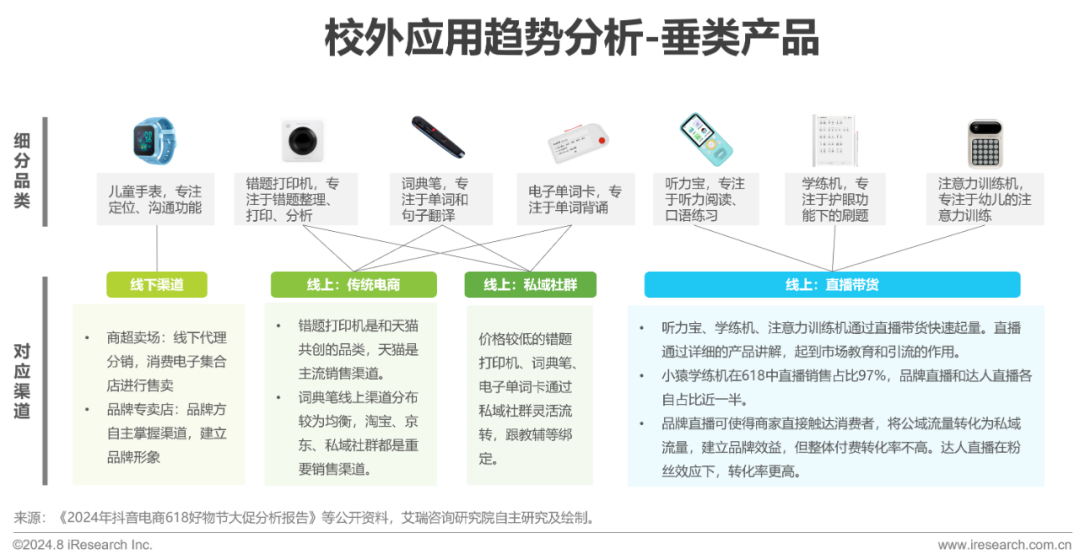 不同于校内完整、闭环的学习场景,校外的学习场景和痛点需求更加分散,除了综合类的学习平板外,各类畅销的垂直品类无外乎均找到了有效的细分场景,传统品类中有专注于外出定位、沟通的儿童手表,专注于单词和句子翻译的词典笔等,创新品类中有专注于听力阅读、口语练习的听力宝、专注于护眼功能下刷题练习的学练机等。在具备了有效细分场景这一必要条件之后,寻找到适应时代发展、匹配品类特点的渠道则成为关键的下一步。在线上渠道未兴起的时代,儿童手表更依赖线下商超和专卖店;随着电商平台、私域社群的发展,更低客单价、更易流转的错题打印机、词典笔、电子单词卡流行起来;短视频时代,直播讲解、公域引流更适合新品类的推广,成为听力宝、学练机等创新品类的关键销售渠道。未来,教育智能硬件仍需要进一步深挖更多的细分场景,并结合适配产品特色和时代特征的渠道,以打造特定场景的爆款产品。