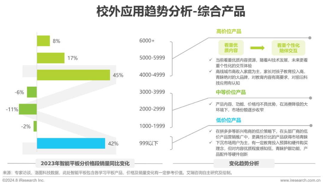 当前校外的综合功能产品以学习平板一类独大。从应用趋势来看,未来学习平板市场可能呈M型发展,高、低价位产品持续起量,中等价位产品市场收窄。对高价位产品而言,当前独家优质内容已形成差异化竞争力,随着AI技术的发展,未来用户可能更看重个性化、陪伴性的交互体验。这类产品以高线城市高收入家庭为主,家长对孩子教育投入高,青睐绝对的大品牌,对教育内容有高要求,对前沿科技应用有认知。对低价位产品而言,在新兴电商的低价策略、头部厂商的低价产品推广中,低价产品势头强劲。这类产品以下沉市场用户为主,他们有着一定教育投入预算和硬件购买理念,但对内容优质程度感知低,青睐护眼功能、产品配件等硬件创新。而中等价位产品由于内容、功能、价格均不具鲜明优势,在消费降级的大环境下,市场份额逐步收窄。
