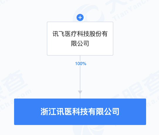 天眼查APP显示,近日,浙江讯医科技有限公司成立,法定代表人为尹大海,注册资本1000万元,经营范围包含:人工智能硬件销售;人工智能应用软件开发;人工智能理论与算法软件开发;人工智能基础软件开发;远程健康管理服务;智能家庭消费设备销售等。天眼查股权穿透显示,该公司由科大讯飞旗下讯飞医疗科技股份有限公司全资持股。