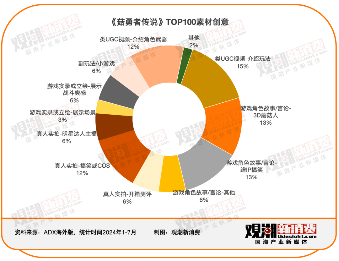 在视频创意上,从上述《菇勇者传说》的素材创意也可看出,视频素材包括真人实拍、玩法介绍、角色介绍等多个类别,趣味性更强,获取的不只是放置开箱玩家,也包括大量泛用户,包括RPG玩法玩家、像素题材玩家等。