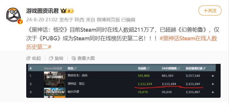 事实也是如此。根据博主@游戏圈资讯君的统计,8月20日晚9点钟,《黑神话》同时在线人数突破211万,超越今年年初的黑马游戏《幻兽帕鲁》,成为Steam同时在线榜历史第二名,成绩仅次于《PUBG》的同时在线最高记录325万。