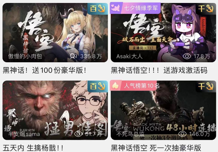 打开B站你会发现,几乎所有UP主都在直播打《黑神话》,不管擅长与否,喜欢与否,因为它意味着关注度。我的一位玩《原神》的朋友无奈表示,昨天想找个主播帮忙打深渊,结果发现全在“玩黑猴”。