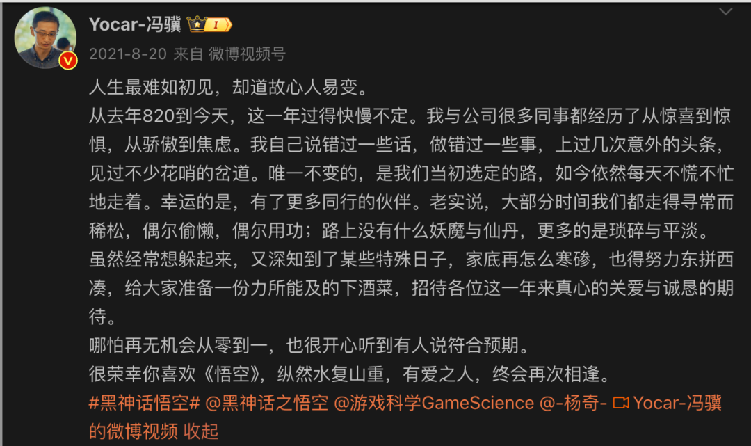 简单回顾下背景。2020年8月20日《黑神话》释出首支预告PV,不止主机圈,半个游戏行业都在沸腾,因为它“让大家看到了国产3A”的希望。差不多是当年年底,主创杨奇一条发布于2013年的微博旧文被翻出来,并指出有对女性不友好的言论。