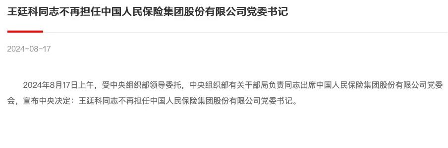 据中国人保官网消息,8月17日上午,中央组织部有关干部局负责同志出席中国人保党委会,宣布王廷科不再担任中国人保党委书记。