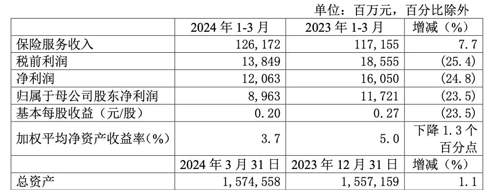 但从业绩上看,中国人保的步子迈得不大,甚至回落。2024年一季度,中国人保营业收入1387.78亿元,同比微增0.7%;净利润89.63亿元,同比下滑23.5%。