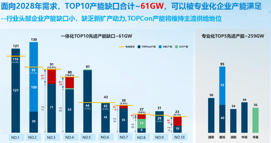 TOPC10企业的电池缺口约为61GW,然而专业TOP5电池企业产能就高达259GW(其中TOPCon约为168GW),完全可以满足TOPC10企业的电池缺口。