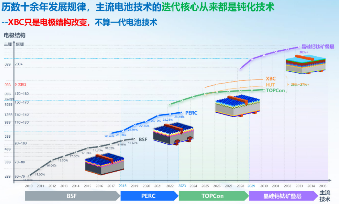 XBC,从本质来说是电极的极致优化:主栅变为0,副栅也变为0。因此,XBC只是电极结构改变,根本就不能算不上一代电池技术。在未来,0BB+更多的副栅线可能更加适配钙钛矿叠层。张映斌表示,行业中有些企业说BC是终极技术,是终极发展方向,建议还是要谨慎一些。