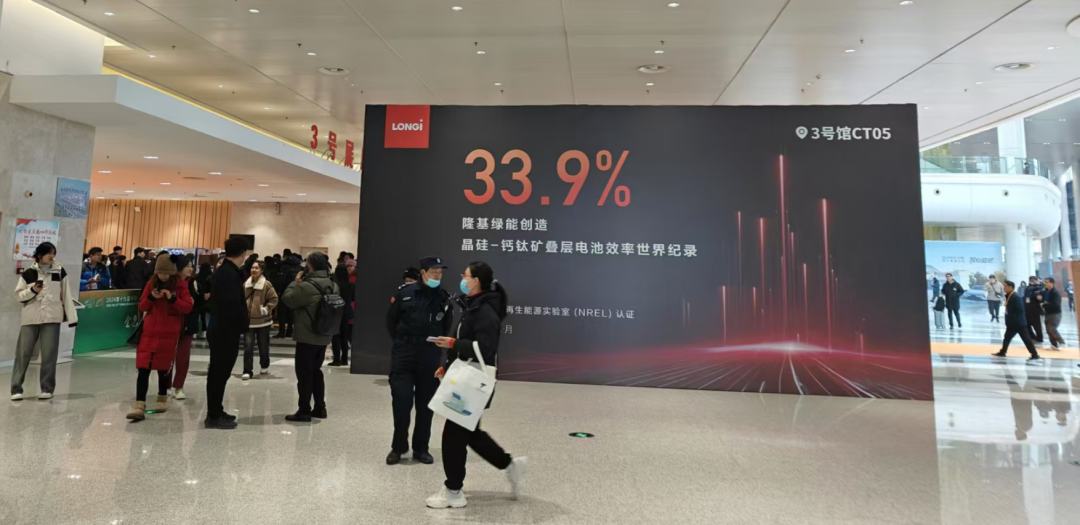 隆基绿能保持的多项世界纪录,令其在所有对外宣传中自带光环。图为2024年济南光伏展,隆基绿能的现场广告牌。赶碳号摄