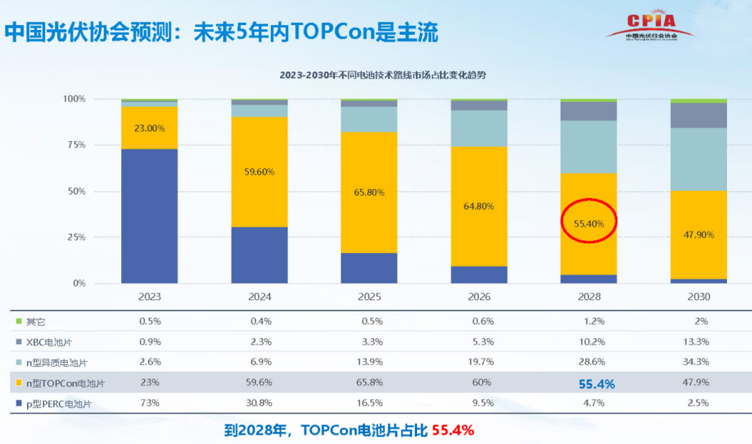 中国光伏行业协会预计:至2028年,TOPCon电池片占比为55.4%。