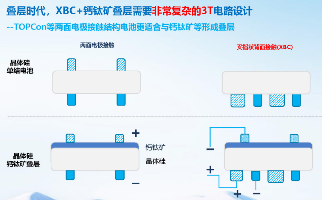 HJT天然适合与钙钛矿电池做叠层电池,TOPCon做一层TCO透明导电薄后,也可以和钙钛矿电池做叠层电池。但对于隆基的黑猫9来说,就很麻烦,因为正面没有电极,电极都在背这样,就需要另外一条线路专门将钙钛矿电池的电流引导出来。