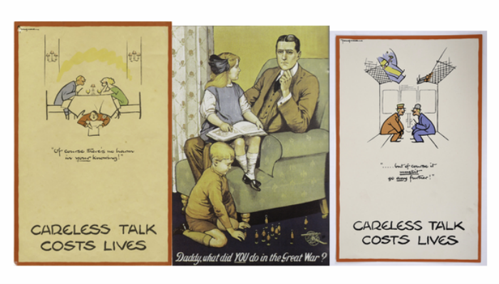 右边的另一幅广告则以诙谐的方式照亮了1940年间的黑暗时日。为英国讽刺漫画杂志《Punch》供稿的漫画家Fougasse在“无心漫谈,消耗生命”的主题之下,描绘了一幅希特勒藏身桌下,另外二人对话的场景,“当然,据你所知这里很安全!”