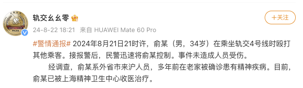 上海轨交公安通报,8月21日21时许,俞某(男,34岁)在乘坐轨交4号线时殴打其他乘客。接报警后,民警迅速将俞某控制。事件未造成人员受伤。经调查,俞某系外省市来沪人员,多年前在老家被确诊患有精神疾病。目前,俞某已被上海精神卫生中心收医治疗。