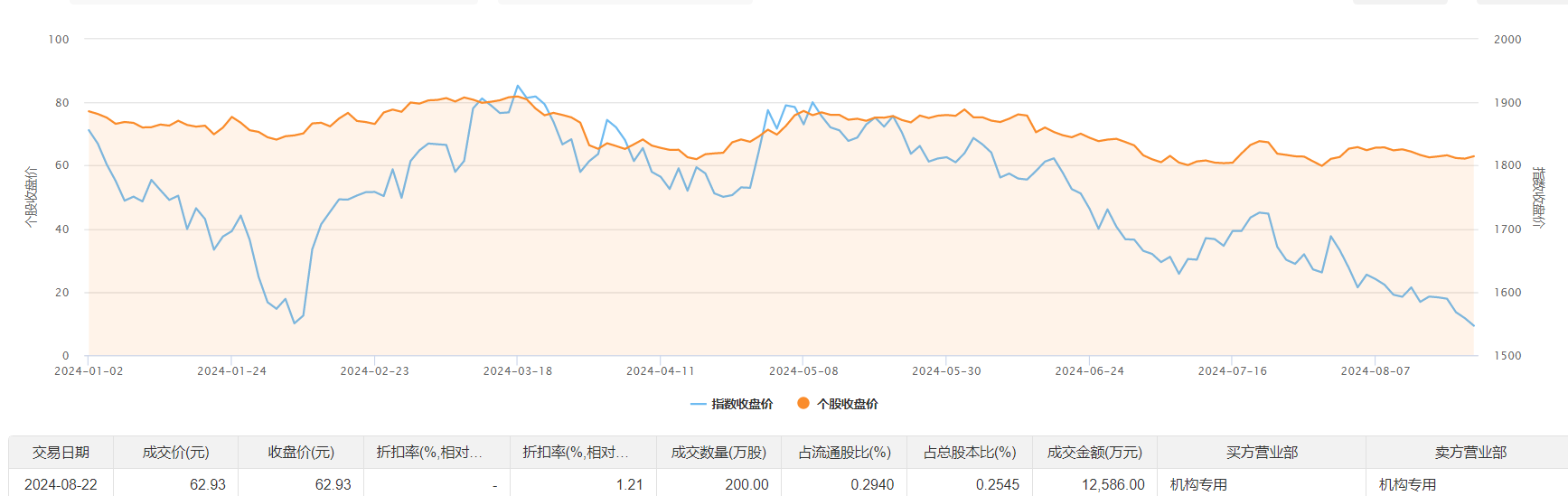 新产业8月22日大宗交易成交200万股,成交额1.26亿元,占当日总成交额的44.2%,成交价62.93元,较市场收盘价62.93元持平。
