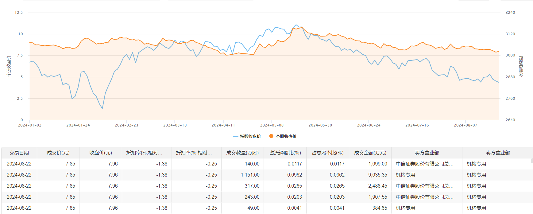 保利发展8月22日大宗交易成交1900万股,成交额1.49亿元,占当日总成交额的13.15%,成交价7.85元,较市场收盘价7.96元折价1.38%。