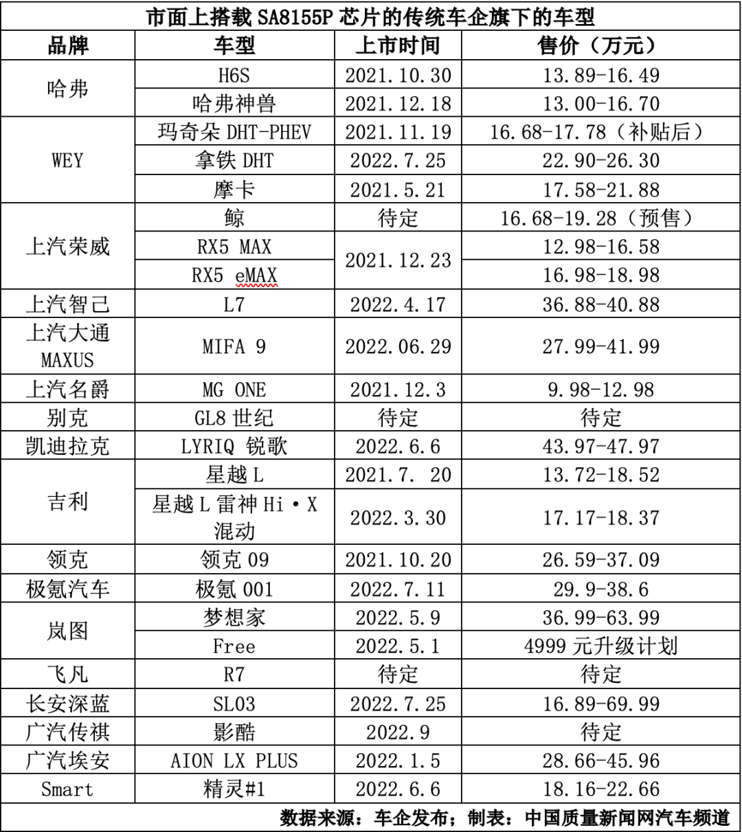 “8155这块芯片相当于6年前手机的高通855芯片,属于高端旗舰级别,事实上诞生于2019年的高通8155其实就是基于855手机芯片魔改而来的,当时高通855芯片在业内也算是领先水平,该芯片多应用在各品牌的旗舰级手机上,因此基于855打造的车规级8155性能也不会差。”有专家认为,车规级芯片需要经过高温高压高震动环境严格测试认证,因此性能普遍落后于同时代消费级芯片。