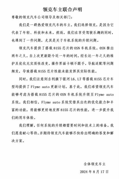 8月19号,领克车主联合声明走红网络。声明称,领克汽车搭载8155芯片的OS N车机系统已经推出两年,自上次更新距今近一年的时间,经长达一年的维护及优化没有实质性改变,操作界面卡顿不跟手,导航适配等问题频发。
