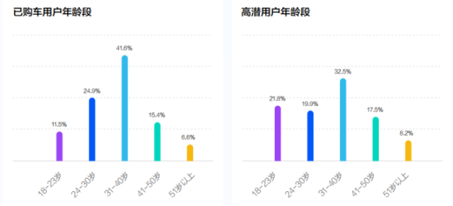 无独有偶,巨量算数数据显示,新能源汽车的已购车用户主要分布在24-40岁的中坚人群,而高潜用户则表现出对新能源汽车的购买意愿,年龄段分布逐渐趋于均衡化,尤其18-23岁及41岁以上的人群兴趣度提升明显,受众群体进一步拓宽。