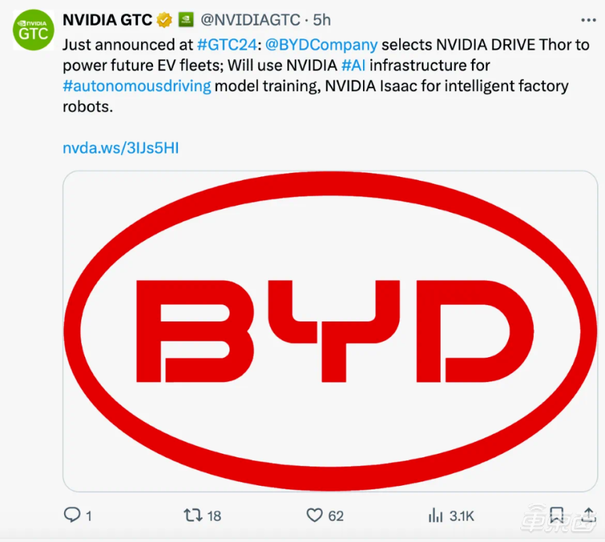 今年三月,比亚迪和英伟达共同宣布,比亚迪车型未来将搭载英伟达Drive Thor芯片,2000TOPS算力。理想极氪长城等车企也表示跟进。