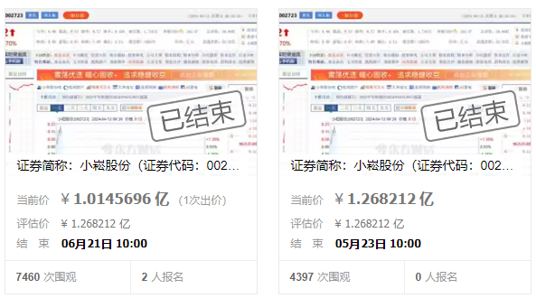 2024年5月22日至23日,广东省深圳市中级人民法院(简称“法院”)在司法拍卖网络平台上进行公开拍卖活动,此次起拍价13601.34万元,保证金2720万元,增价幅度680067元。此次拍卖股票均价为2024年4月11日前二十个交易日均价即每股8.73元,然而拍卖前一日5月21日小崧股份收盘价8.25元/股,已较起拍股价回落5.5%。最终,此轮拍卖以无人出价而流拍结束。