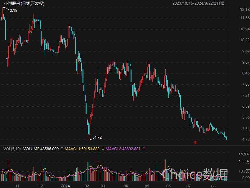 在业内人士看来,小崧股份的第三轮拍卖也不容乐观。2024年以来,该公司股价便跌跌补休。8月22日,小崧股份股价已跌至4.74元/股,年初以来股价已累计跌了53.67%。如今其控股股东所持这1558万股股份的市场价值仅为7384.92万元。