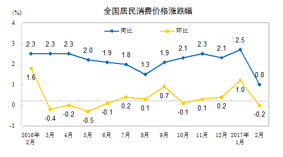 附国家统计局通报:2017年2月份居民消费价格同比上涨0.8%