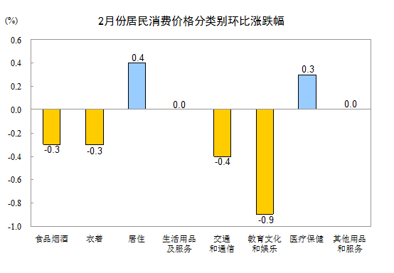 2月份,其他七大类价格环比两涨三降两平。其中,居住、医疗保健价格分别上涨0.4%、0.3%;教育文化和娱乐、交通和通信、衣着价格分别下降0.9%、0.4%、0.3%;生活用品及服务、其他用品和服务价格持平。