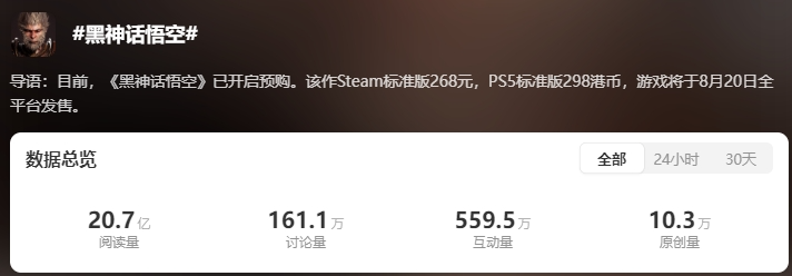 《黑神话:悟空》是一款以中国神话为背景的动作角色扮演游戏。该游戏以四大名著之一、吴承恩所著《西游记》为背景设定,主要讲述小说《西游记》之后的故事,玩家在游戏中将扮演一位“天命人”,为了探寻昔日传说的真相,踏上一条充满危险与惊奇的西游之路。20日当天,游戏上线一小时左右,《黑神话:悟空》Steam同时在线玩家数就已突破100万,当日峰值144万。上线后,许多主播纷纷在短视频平台开启直播,不少直播间观看人数迅速突破万人,更有部分主播的直播间突破10万人。